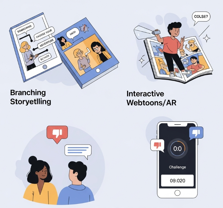 - 개념: “버튼을 클릭할 때마다 주인공의 운명이 결정된다!”와 같이 웹툰이나 스토리에 사용자의 선택 요소를 넣어 다음 장면이나 결과에 영향을 미치게 하는 방식입니다. 더 나아가 AR(증강현실)/VR(가상현실) 기술과 결합하여 가상 환경에서 직접 제품을 체험하거나 스토리에 참여하는 경험을 제공하기도 합니다.