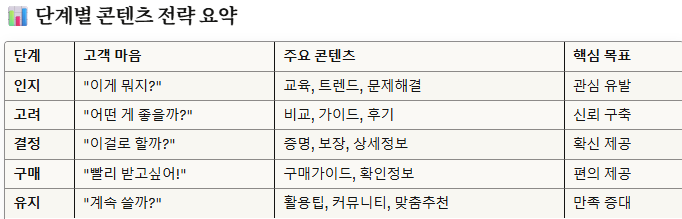 | 인지(Awareness) | 문제 인식 | 교육적, 정보성 | 블로그 포스트, 인포그래픽 |